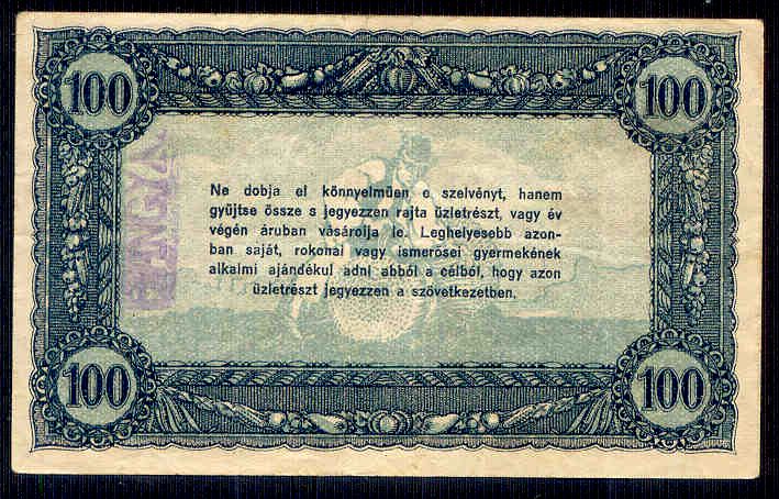 Vásárlási visszatérítés 100 Korona. Abádszalóki Hangya Szövetkezet bélyegzőjével.
